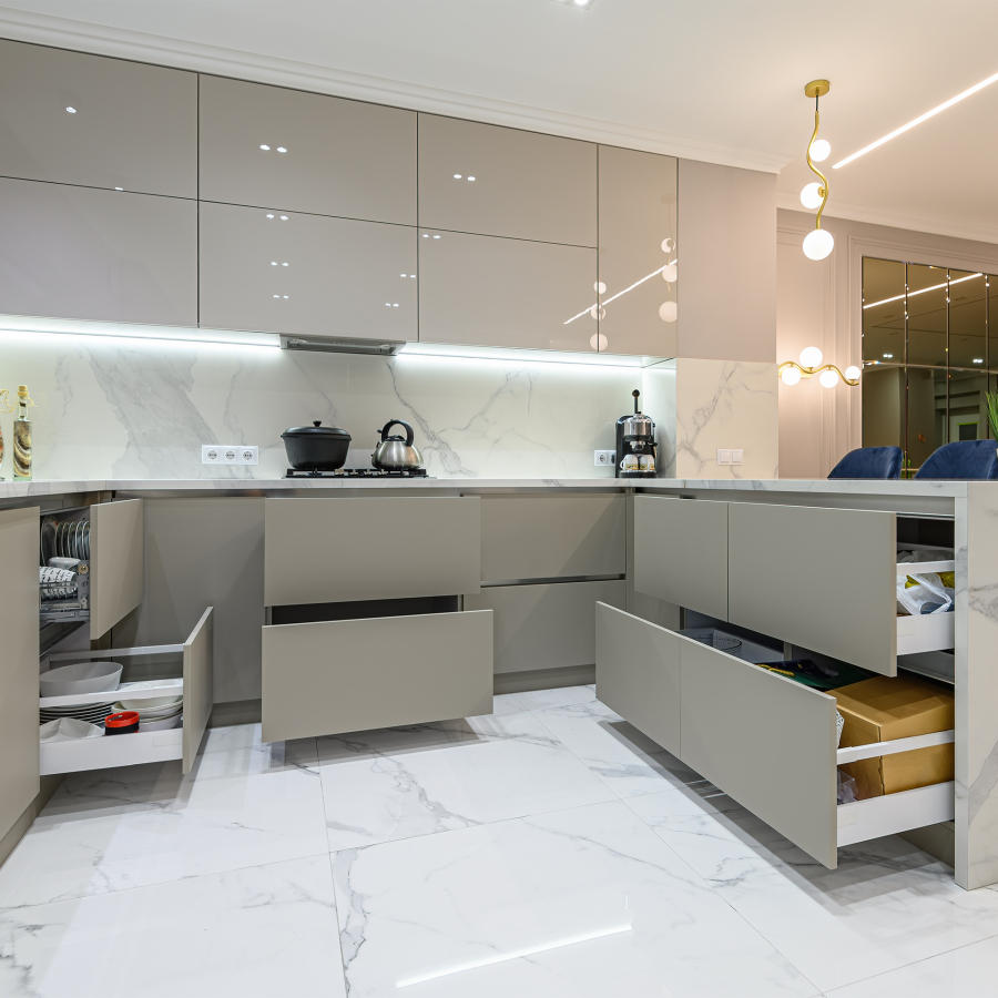 Dar alanlar için akıllı çözümler, geniş mutfaklar için ferah tasarımlar… Her santimi değerlendiren, kapağı açıldığında bile zarif görünen dolap ve çekmece sistemleriyle pratikliği öne çıkarıyoruz.